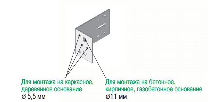Монтаж на бетонное, кирпичное, газобетонное основание предполагает использование фасадного дюбеля. В кронштейне ФК имеется только одно отверстие диаметром 11мм под фасадный дюбель.