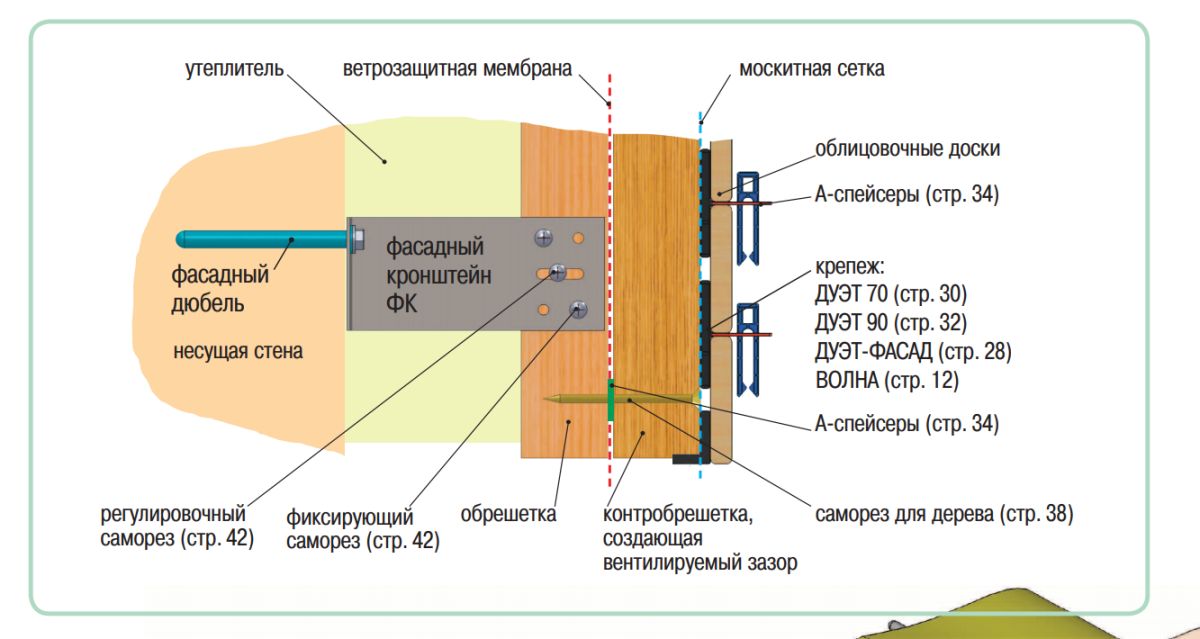 Основное принципиальное отличие фасада с отделочным материалом из древесины от фасада с металлической подсистемой это более простая конструкция подсистемы и оригинальная технология заполнения утеплителем пространства между несущей стеной здания и фасадом.