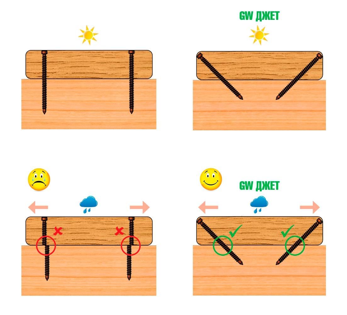GW ДЖЕТ делает доступным качественный скрытый монтаж досок на саморезы с минимальными затратами. Система GW-ДЖЕТ обеспечивает стабильное высокое качество за счет оптимальной точки и угла монтажа, позволяет работать с доской, имеющей деформацию в виде «ложка». GW-ДЖЕТ – обеспечивает неизменное качество вне зависимости от наличия опыта. Все части системы скрытого монтажа GW - ДЖЕТ рассчитаны на работу в системе и должны использоваться комплексно. Замена саморезов или бит на аналоги может не позволить получить ожидаемый прекрасный результат.