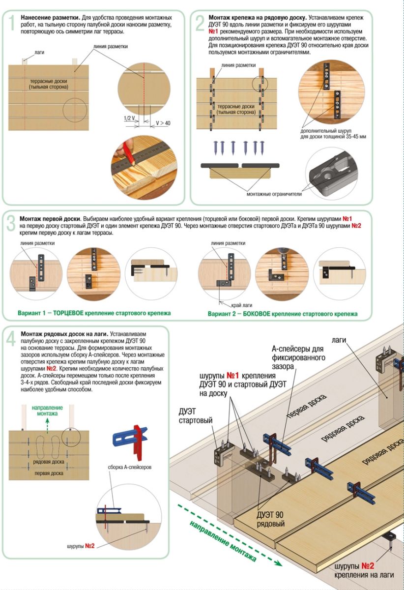 Конструктивно крепеж ДУЭТ90 наиболее удобен для монтажа доски, имеющей прямоугольный профиль (палубная доска, террасная доска).