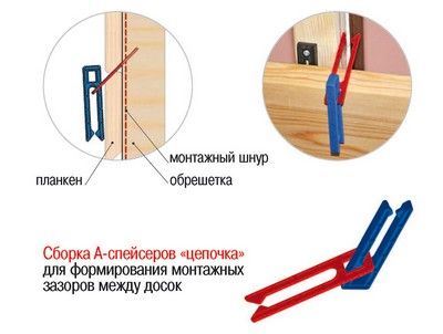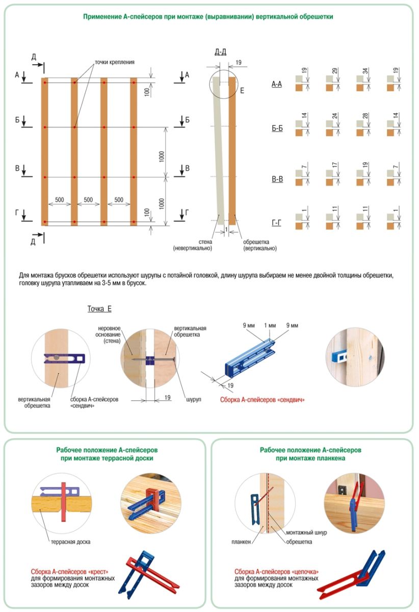 Главное достоинство спейсеров – возможность создавать из них удобные функциональные сборки, которые позволяют заполнять свободное пространство в точке крепления. А-спейсеры применяются для выравнивания стен и потолков, Максимальная статическая нагрузка для А-спейсеров - 150кг. Из А-спейсеров можно создавать сборки (сцепки) для выставления зазора между досками.