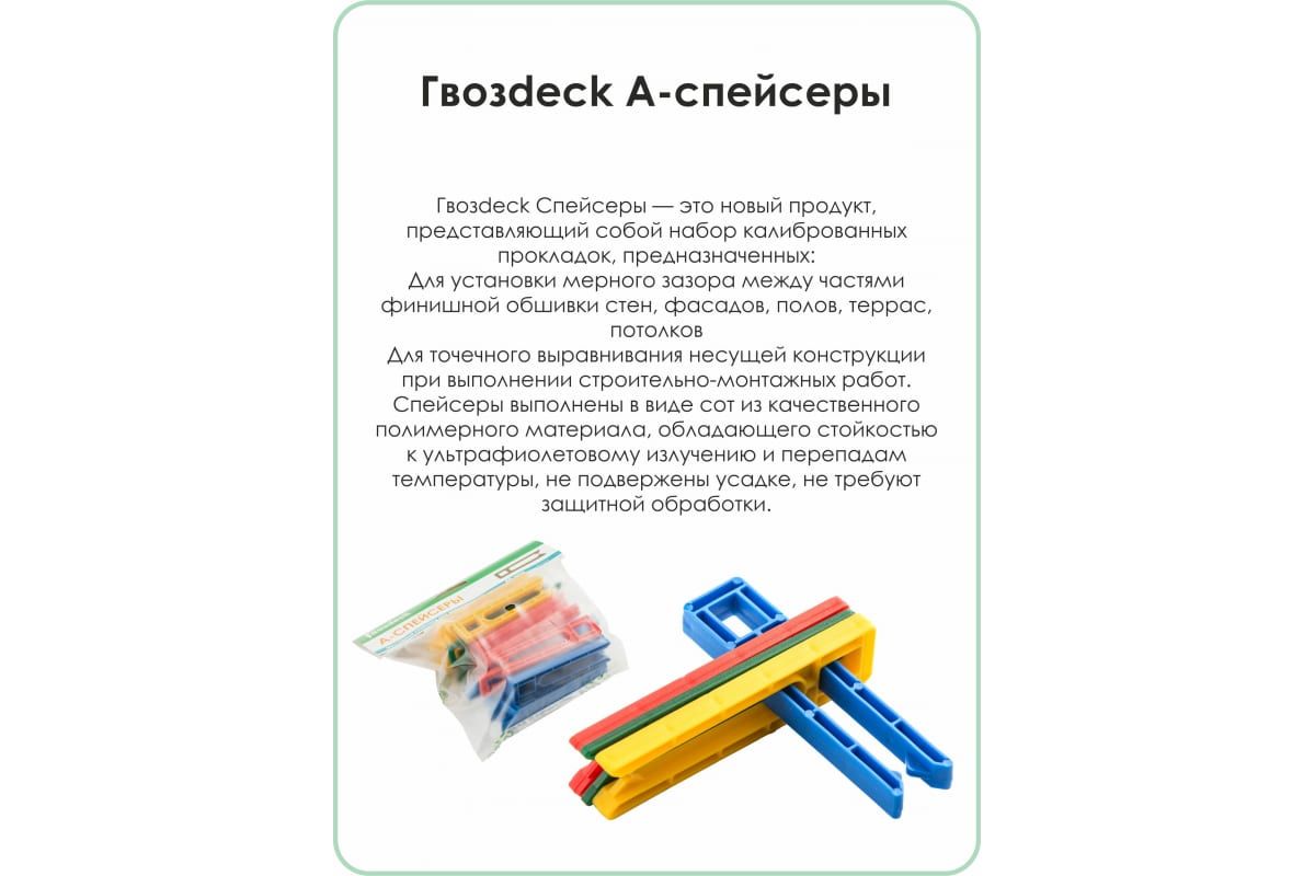 Спейсеры Гвозdeck – это разноцветные калиброванные по толщине прокладки, оригинальной формы, предназначенные для заполнение свободного пространства между новым ровным и старым неровным основаниями в нужной точке. А и Б-спейсеры выполнены в виде сот из качественного полимерного материала, стойкого к перепадам температуры.