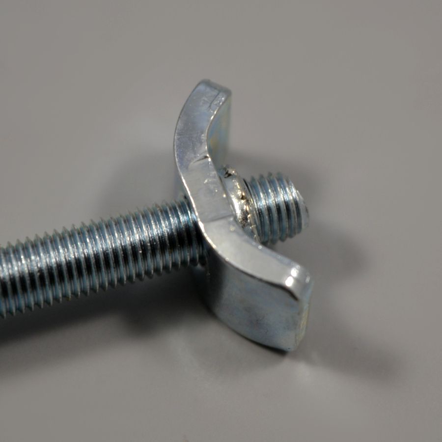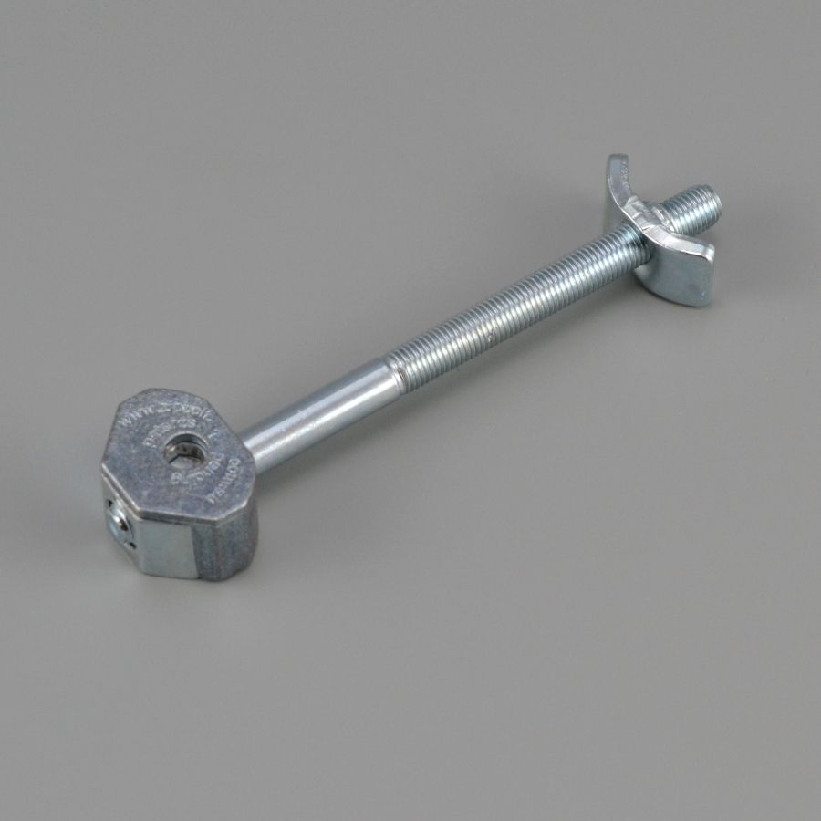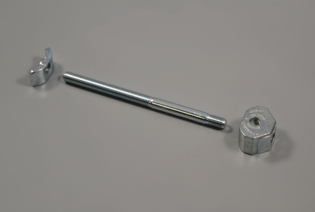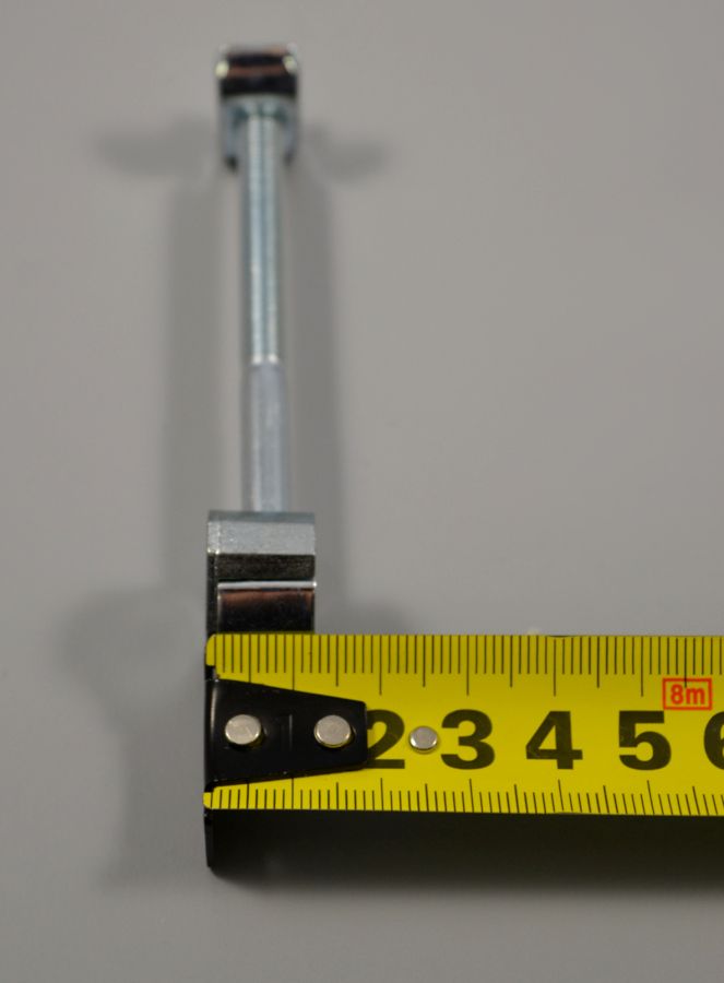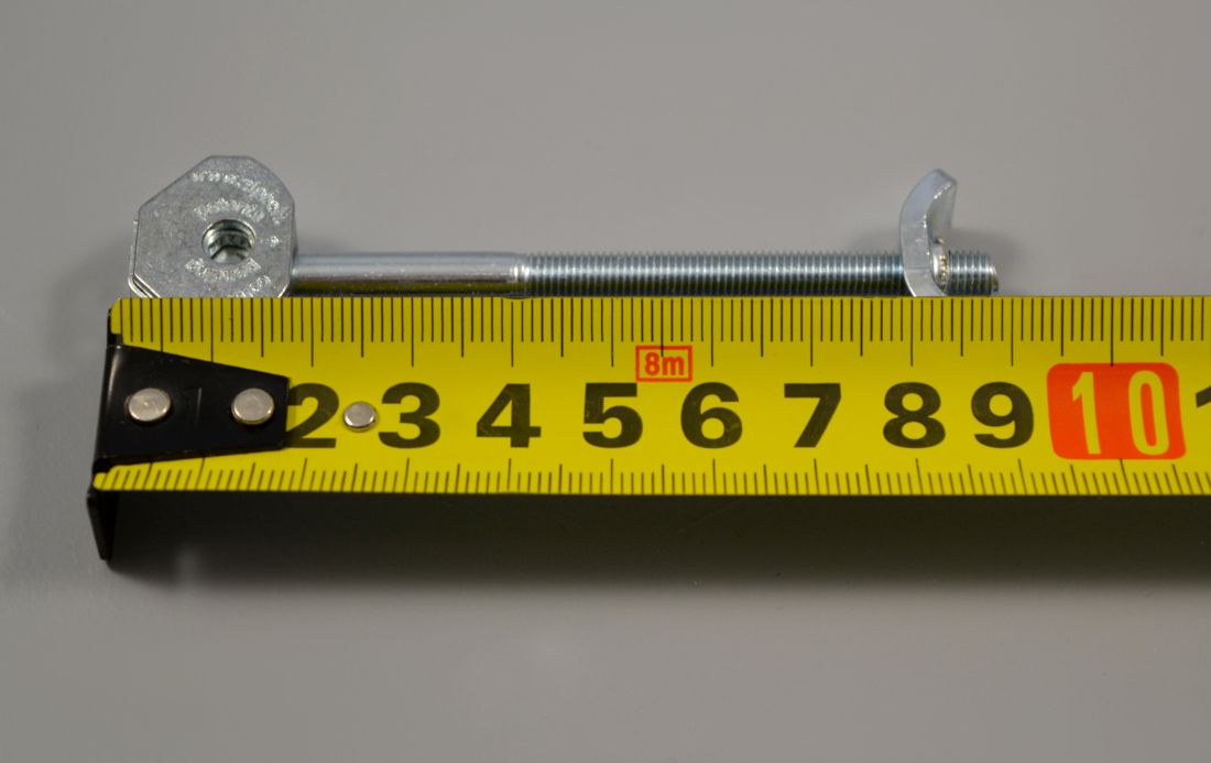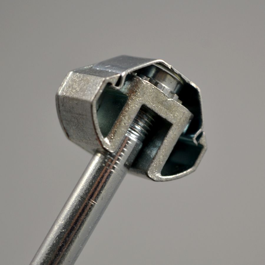 Стяжка выполнена из металла и создает затягивающее усилие достаточное для соединения больших деталей. Эта стяжка по своим функциональным возможностям аналогична стяжкам Zipbolt 10.520 и 10.700. В отличие от них она имеет съемный редуктор, что позволяет соединять детали без фрезеровки паза под шпильку. Кроме того, если отверстия под шпильку сверлить без зазора, то можно выполнять соединение без установки шкантов, так как шток стяжки одновременно будет являться направляющей. В ней уменьшена толщина редуктора, минимальная глубина посадки этой стяжки составляет 12,5 мм - это определяет минимальную толщину соединяемых деталей.