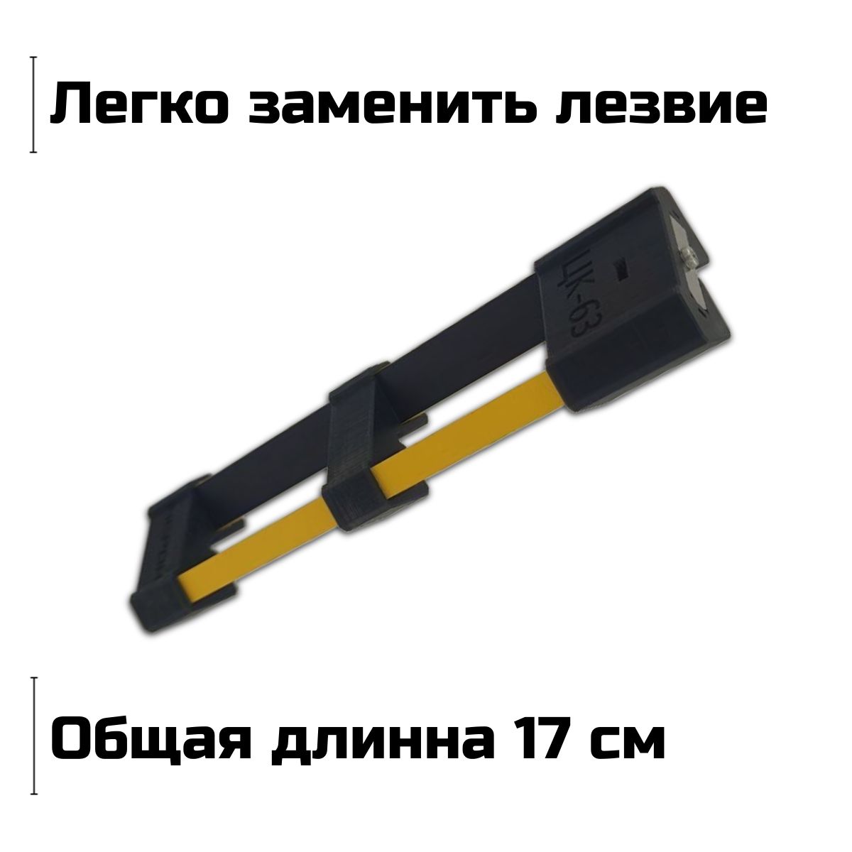 ЦК-63 - это идеальный инструмент для аккуратного и точного съема фаски на кромке толщиной 0.4 мм. (перед снятием фаски, выступающие излишки кромки нужно срезать ножом. ЦК-63 - это НЕ подрезатель кромки, данный инструмент используется для убирания острых краёв на подрезанной кромке). Благодаря эргономичной форме, она удобно лежит в руке, обеспечивая комфорт даже при длительной работе. Оснащена механизмом смены лезвий, что позволяет легко поддерживать инструмент в рабочем состоянии. (лезвия подходят от большинства точилок для карандашей) Незаменима, когда требуется чистая и ровная фаска на кромке ЛДСП.